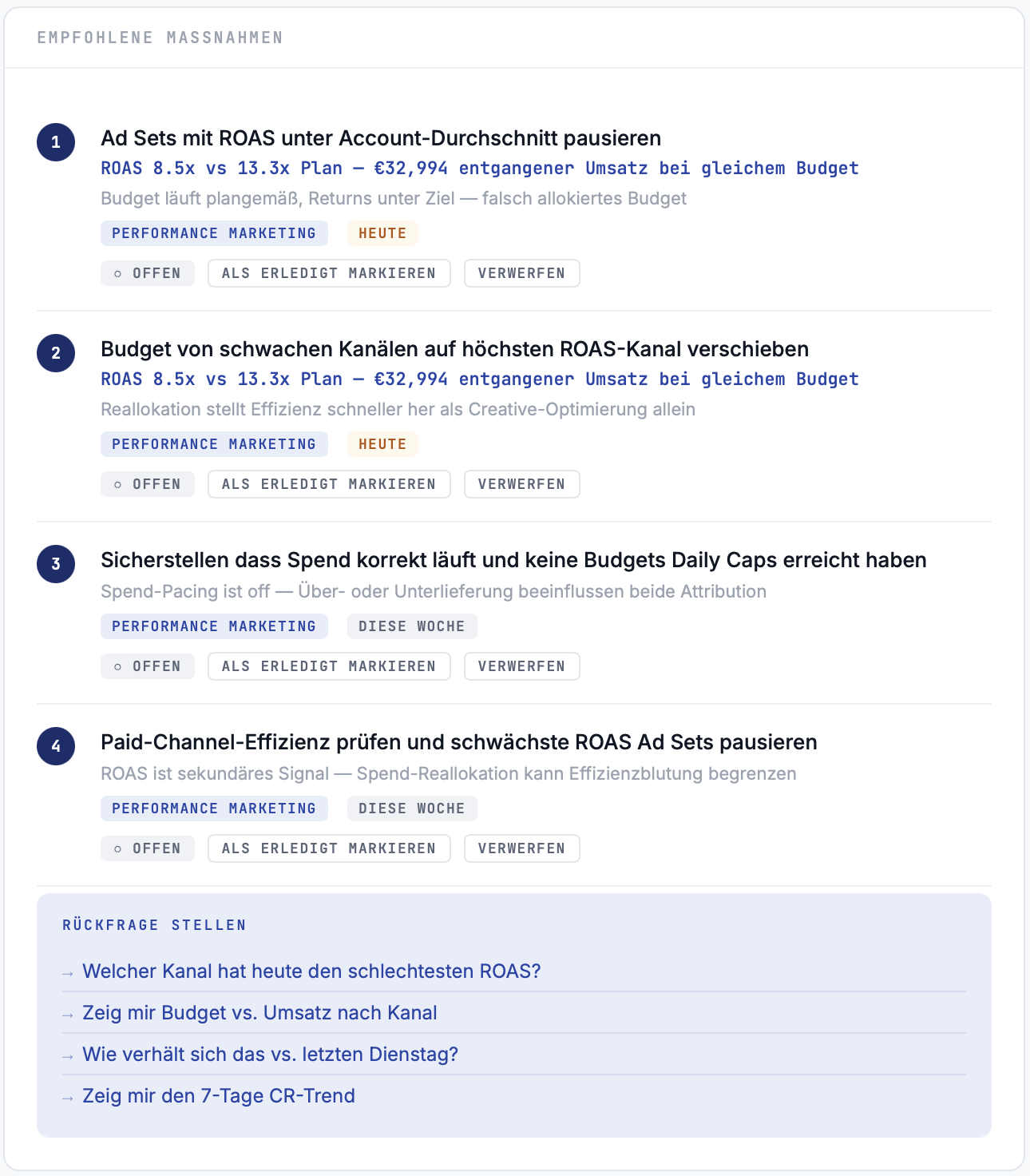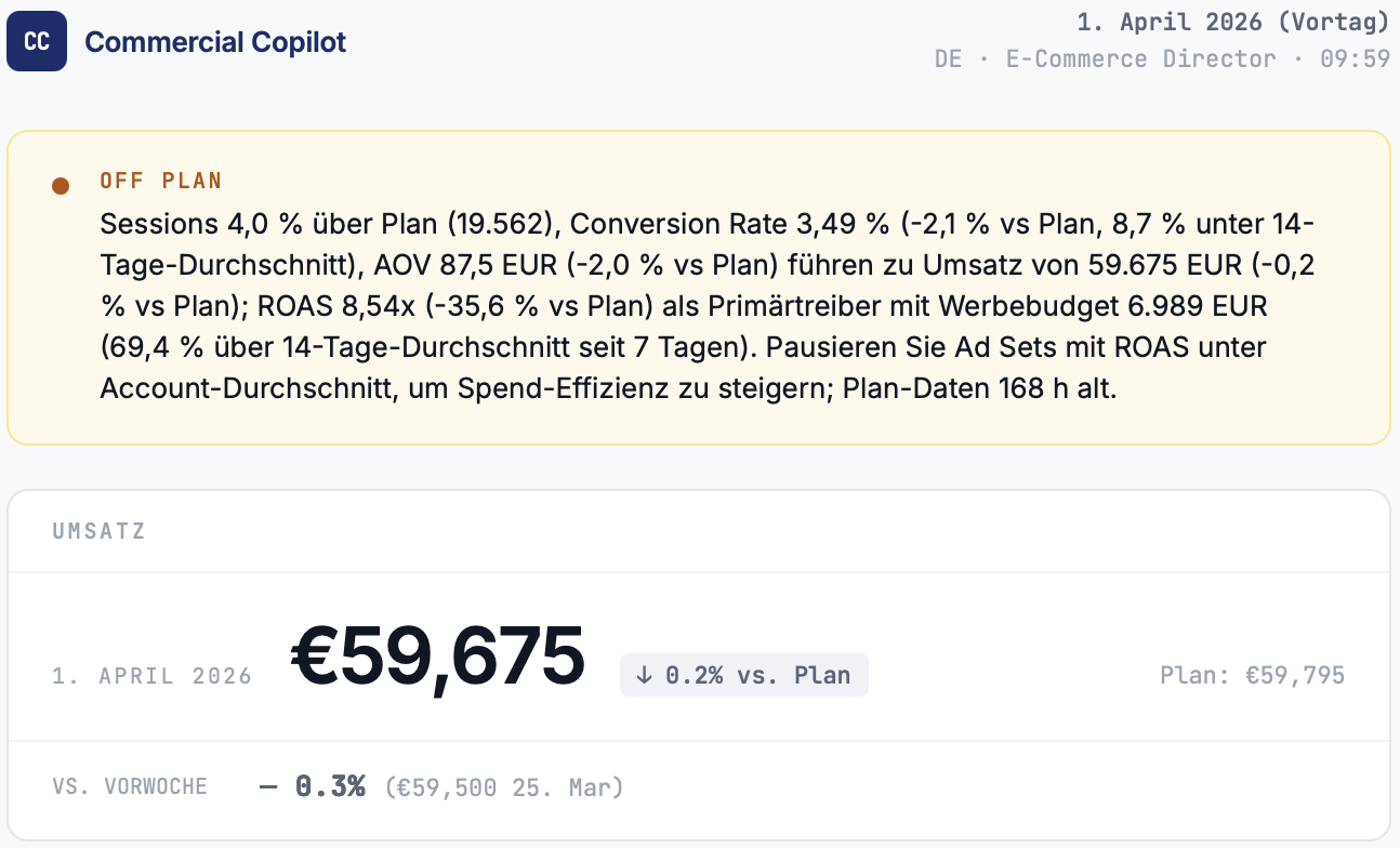 Revenue, conversion rate, spend and ROAS vs plan — with a plain-language explanation of the primary driver and three concrete next steps.